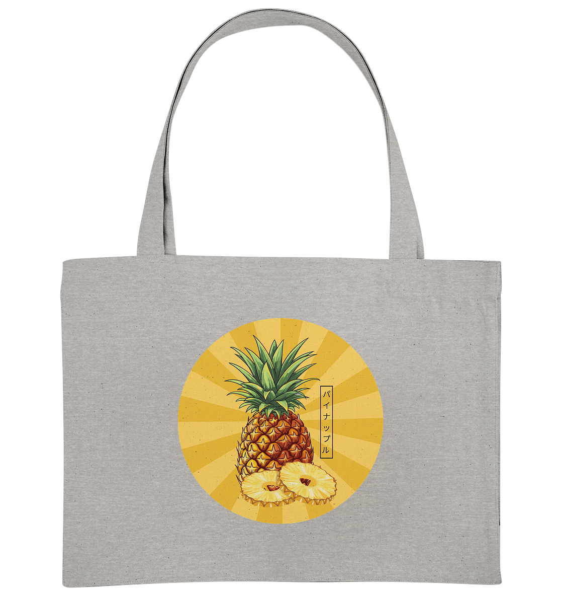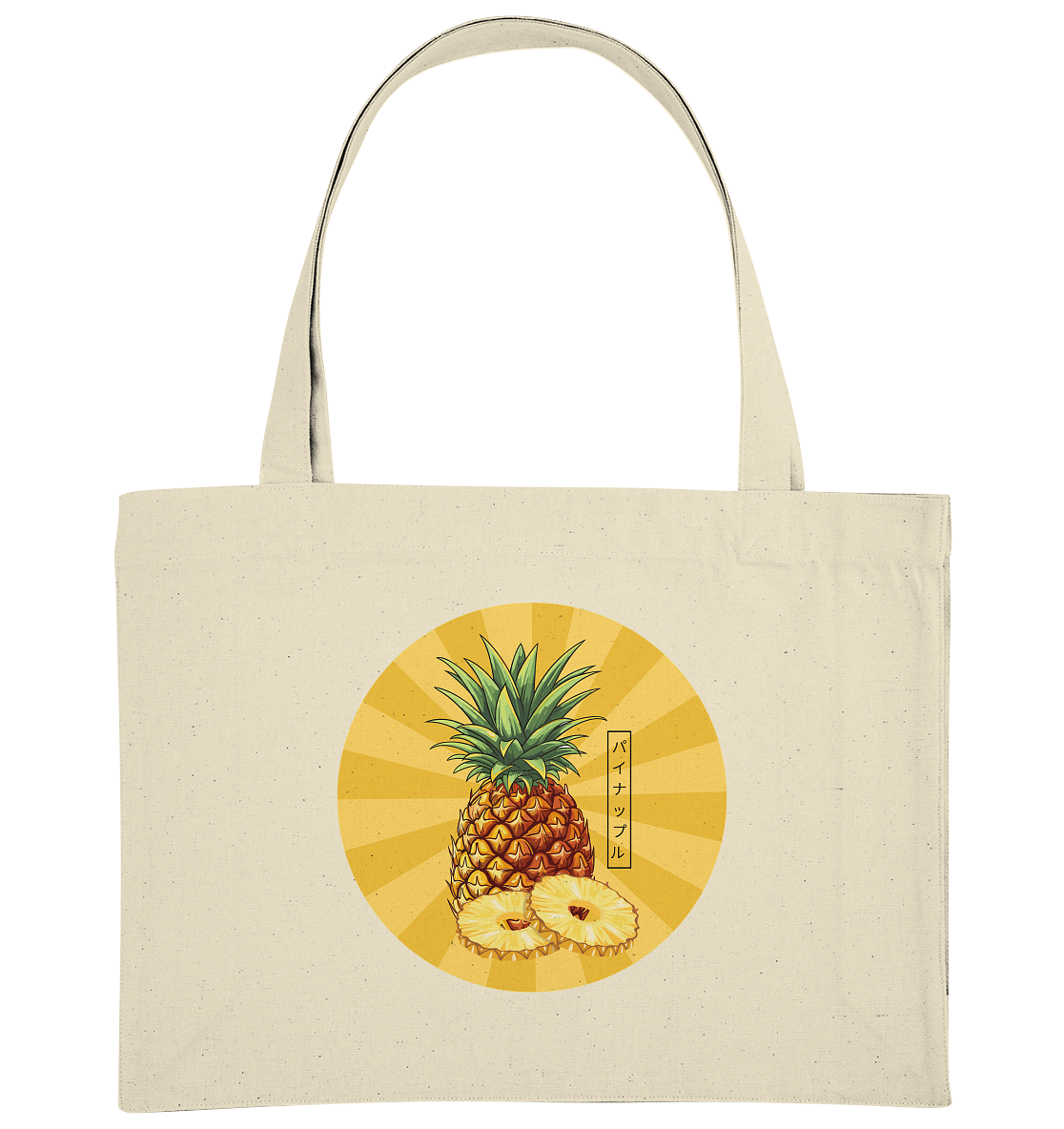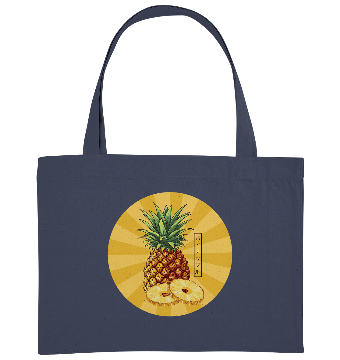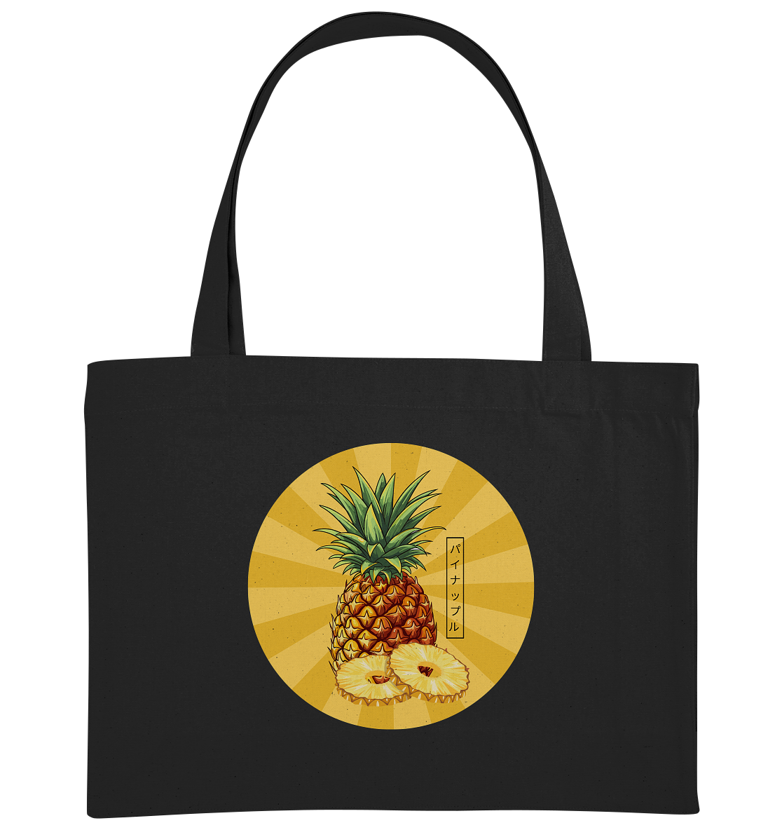 Die süsse Ananas mit ihrem freundlichen Aussehen ist ein Symbol für Gastfreundschaft und Freude. Die japanischen Schriftzeichen パイナップル (painappuru) untermauern das verspielte, tropische Motiv. Trage diese TASCHE als tägliche Erinnerung daran, die Welt mit Neugier und Freude zu erkunden – denn ein Tag ohne Ananas ist wie ein Fischbrötchen ohne Fisch... irgendwie unvollständig!