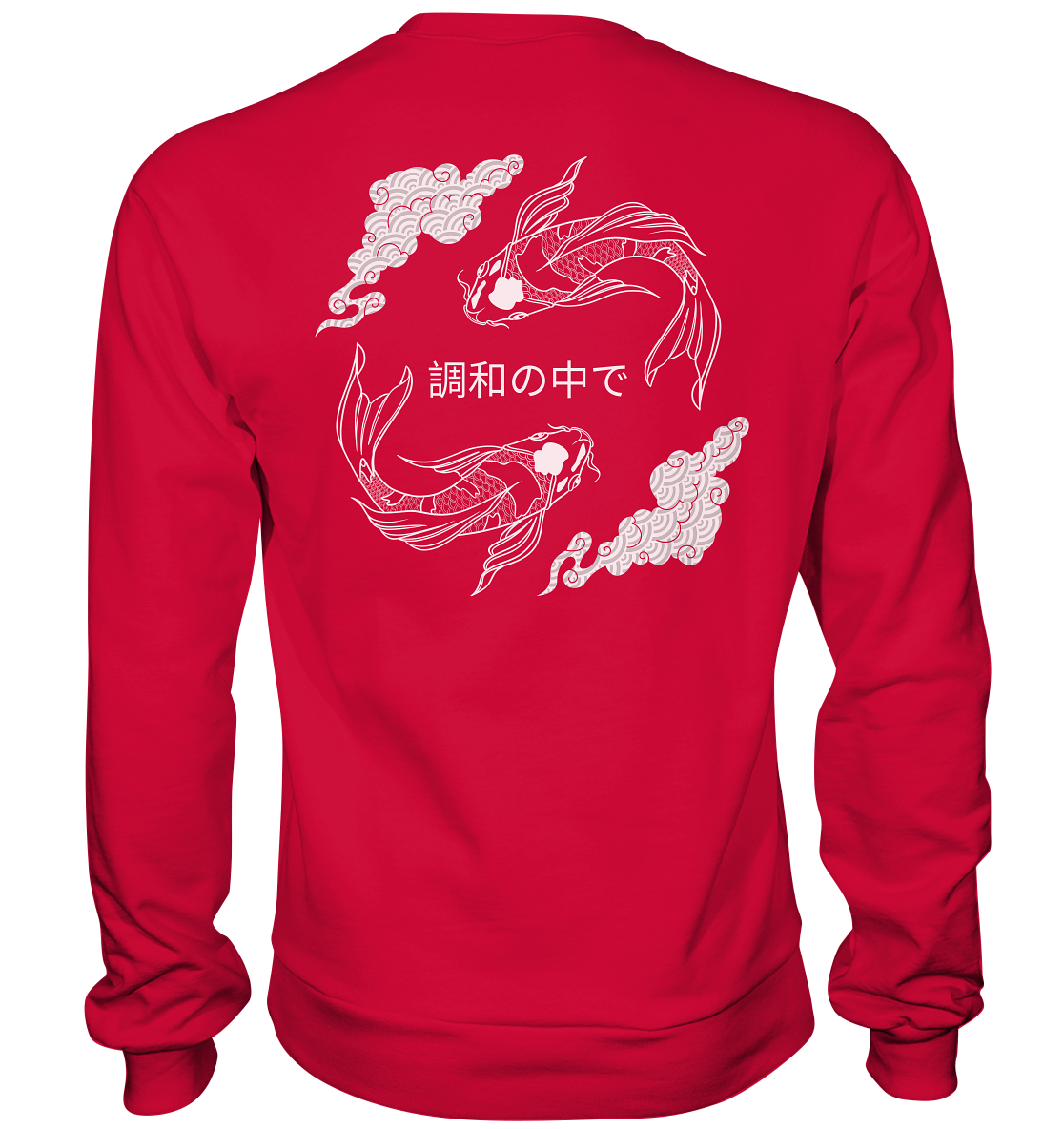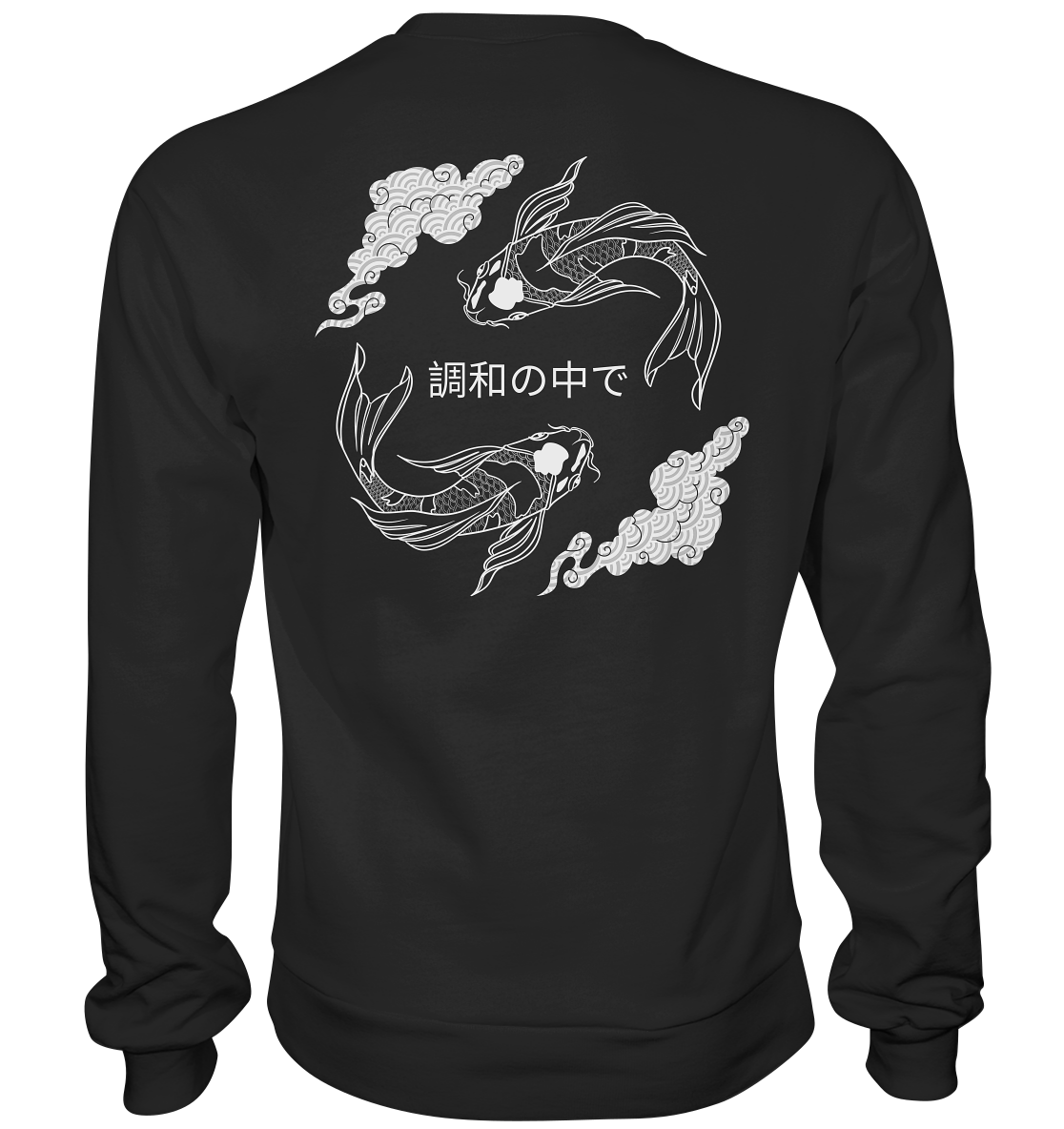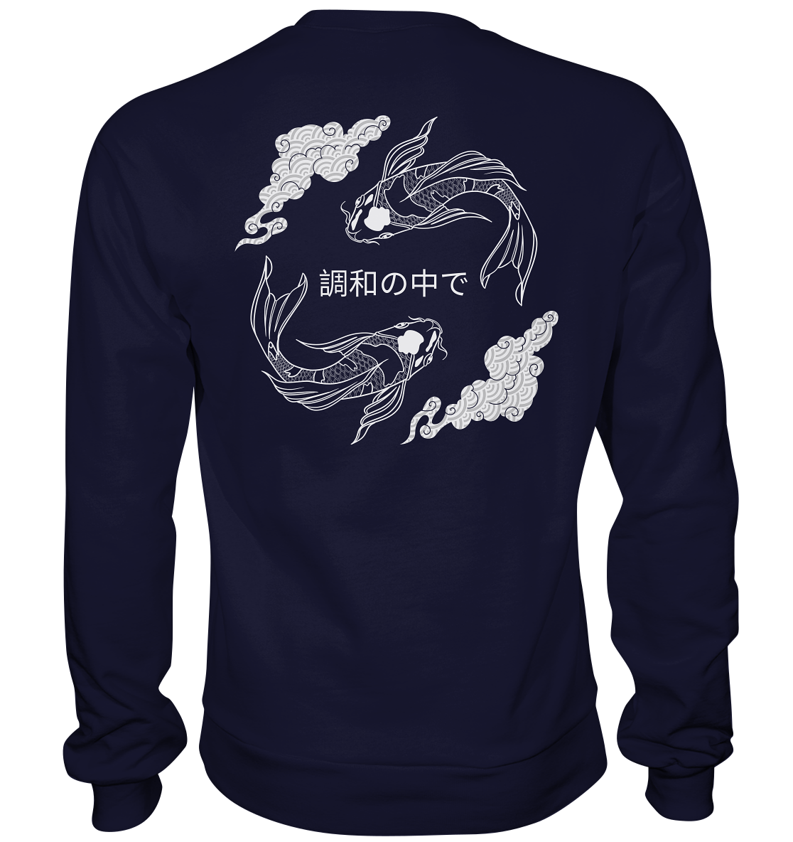 Das Motiv der anmutigen Koi-Fische, umgeben von traditionellen Wolkenmustern, symbolisiert Ausdauer, innere Stärke und die Fähigkeit, gegen den Strom zu schwimmen. Die begleitenden japanischen Schriftzeichen untermauern diese Philosophie: „調和の中で“ (ausgesprochen: Chōwa no Naka de) bedeutet "Im Einklang".