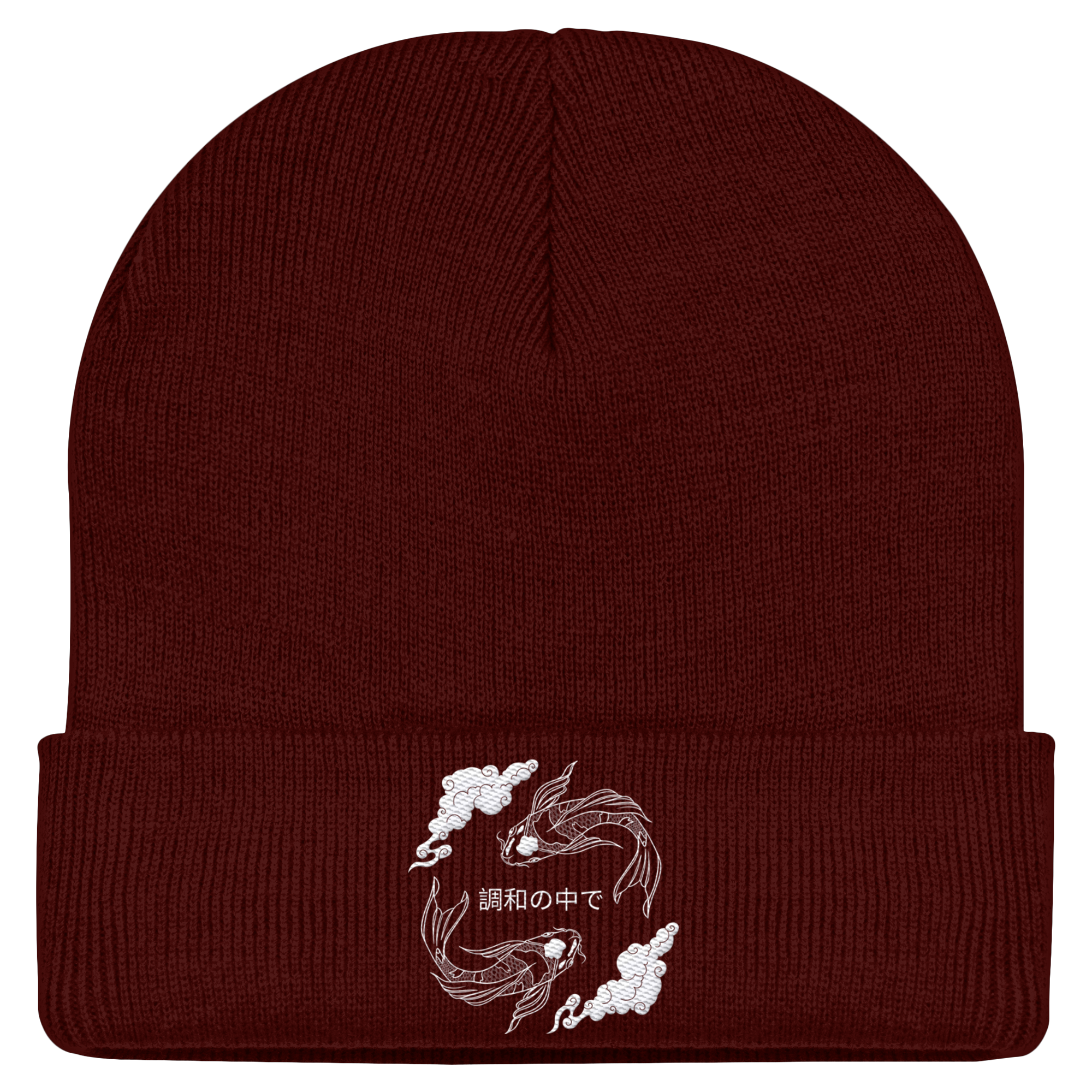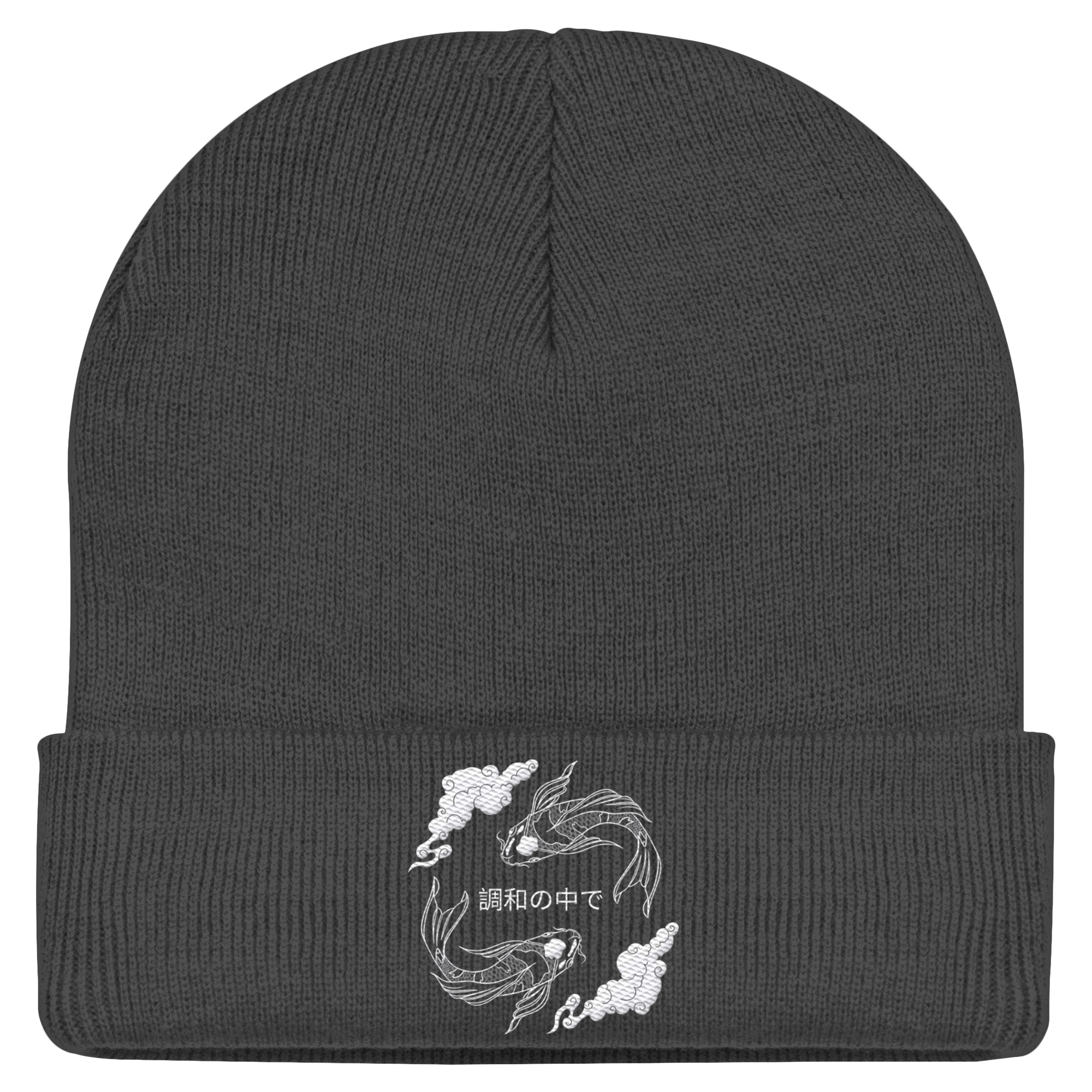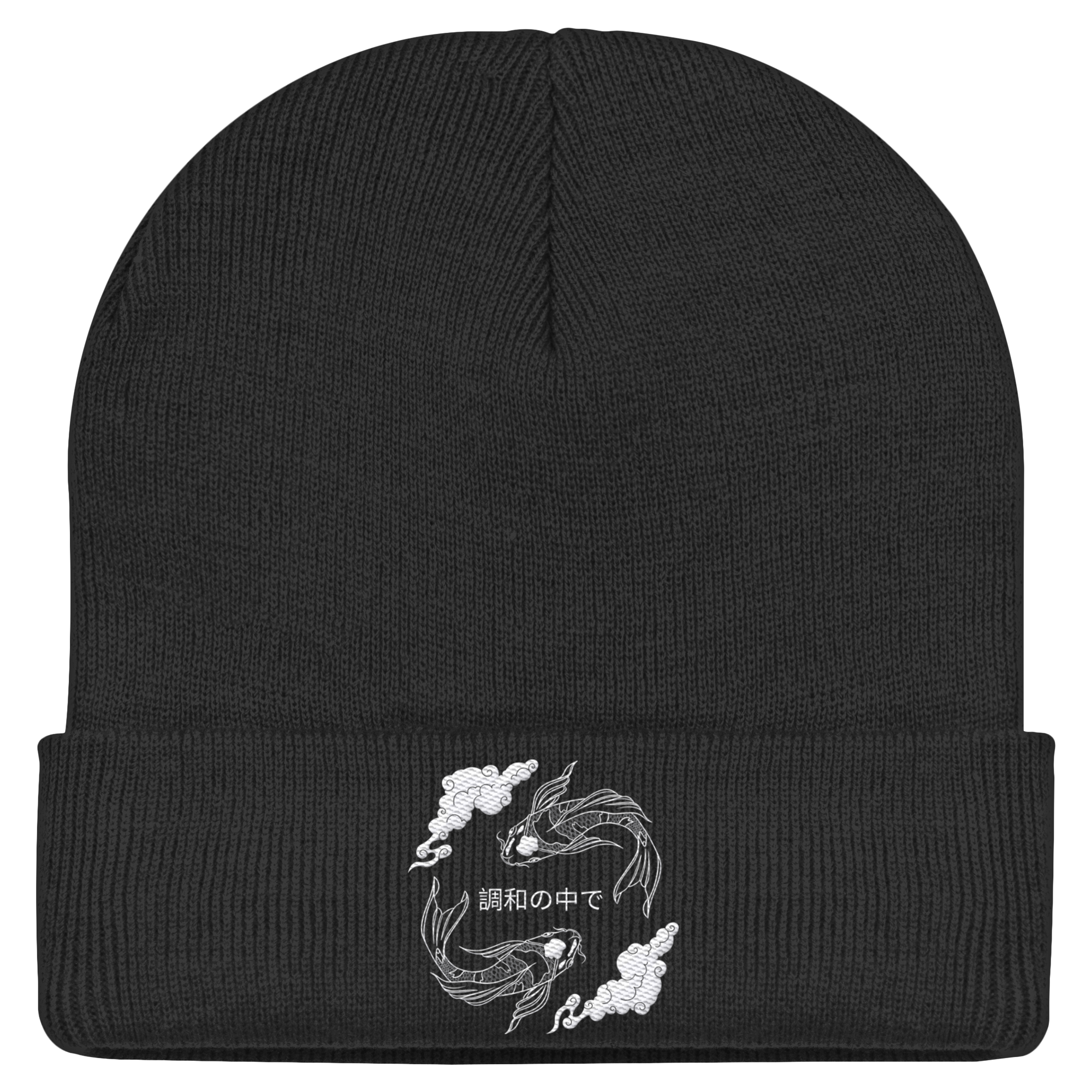Die Koi-Fische stehen für die Reise zur persönlichen Balance und die stille Kraft, die in jedem von uns wohnt. Das Motiv wird per hochwertiger weisser Stickerei veredelt, was der BEANIE eine fühlbare Premium-Qualität verleiht.