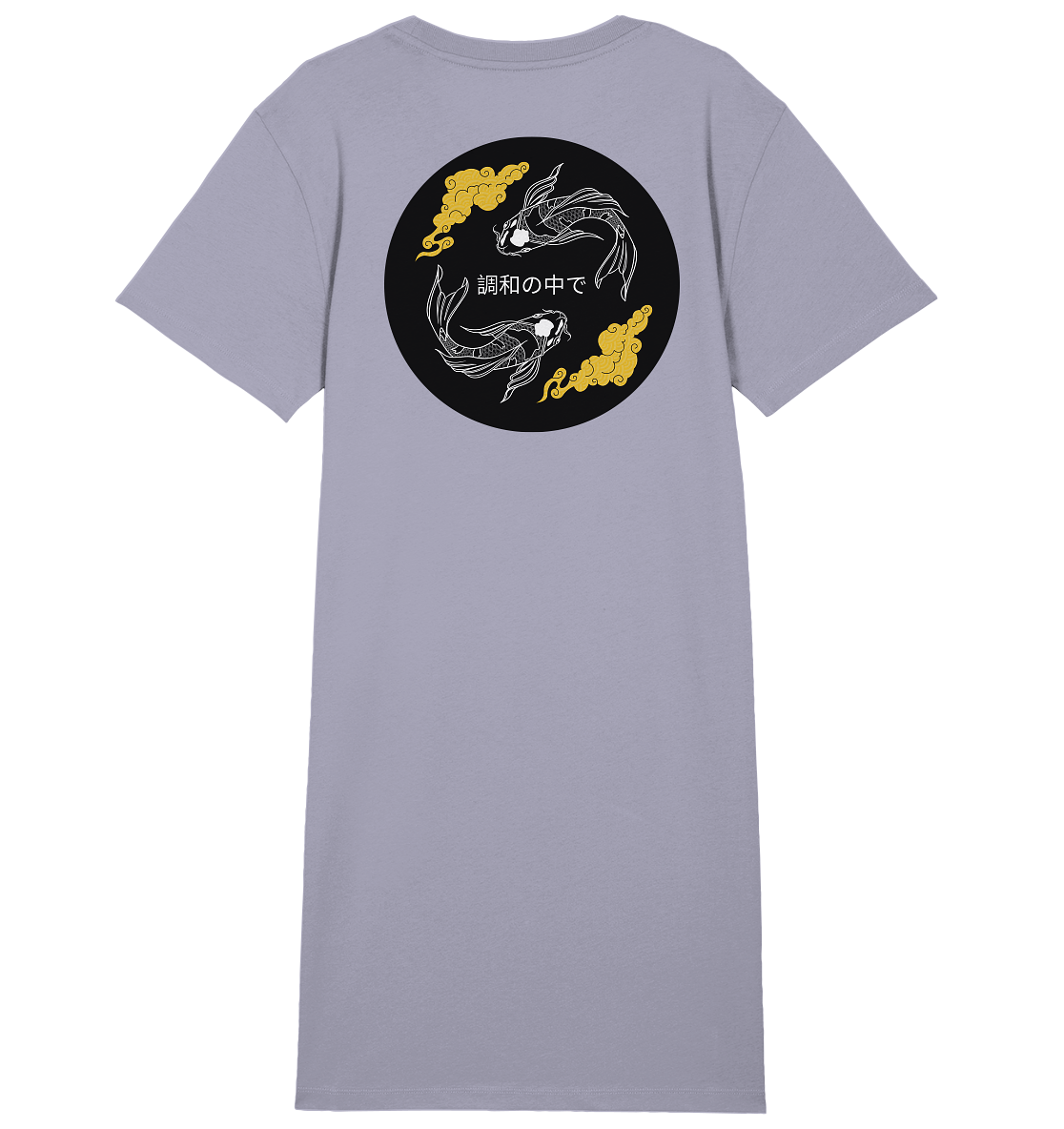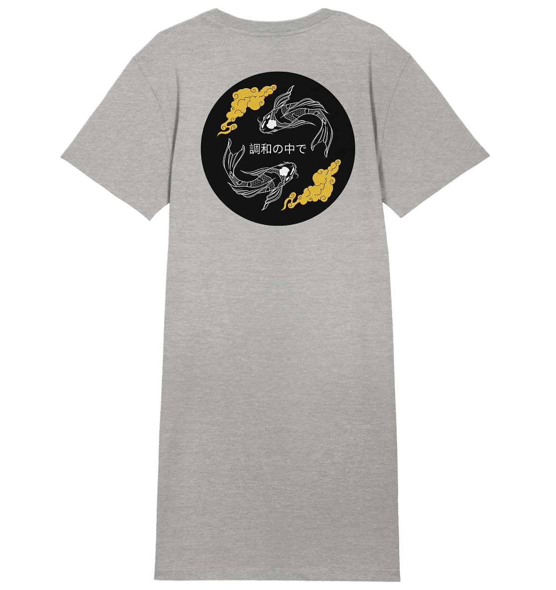 Die Koi-Fische stehen für die Reise zur persönlichen Balance und die stille Kraft, die in jedem von uns wohnt. Der weisse Aufdruck auf den hellen Stoffen wirkt subtil und elegant, was die Gelassenheit des Motivs unterstreicht. Trage dieses KLEID als visuellen Anker, der dich daran erinnert, selbst inmitten von Chaos Ruhe zu finden.