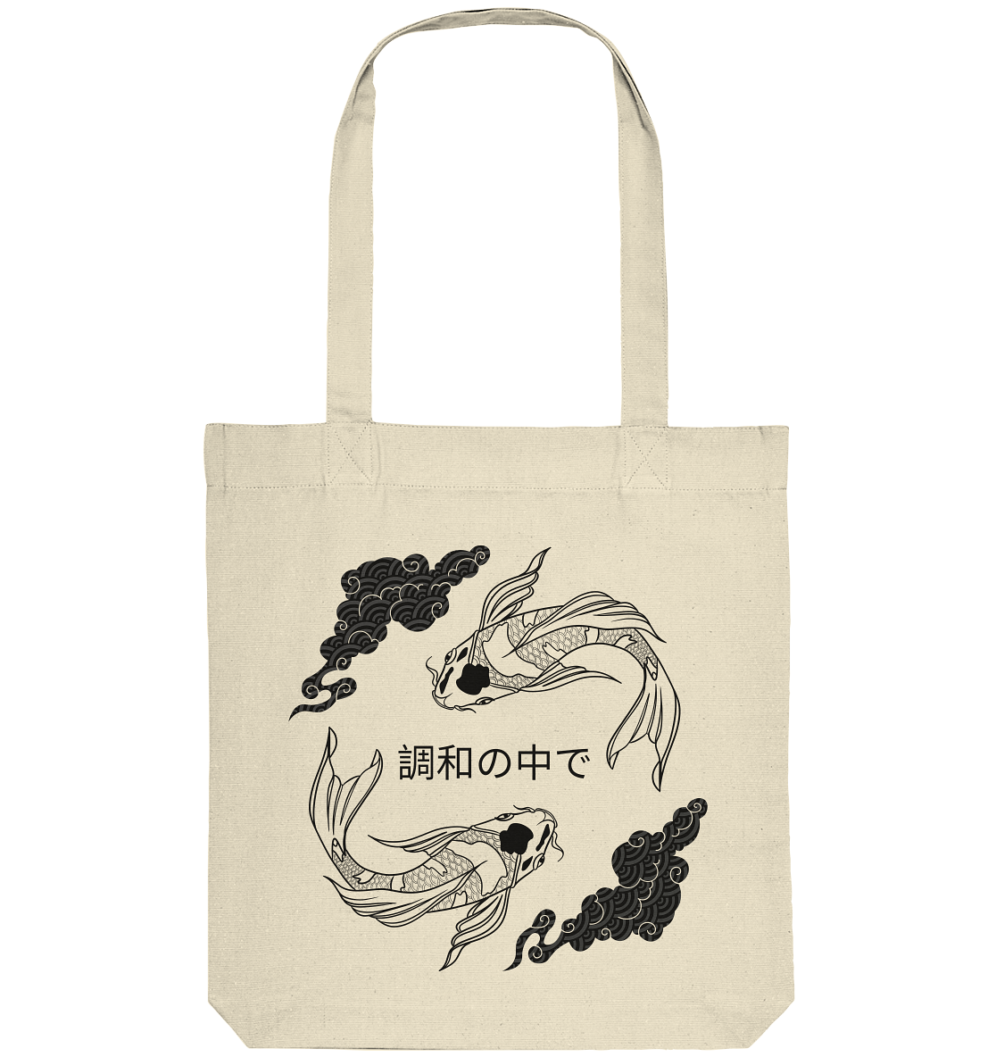 Die Koi-Fische stehen für die Reise zur persönlichen Balance und die stille Kraft, die in jedem von uns wohnt. Der schwarze Aufdruck auf dem Stoff sorgt für einen klaren, scharfen Kontrast. Trage diese TASCHE als visuellen Anker, der dich daran erinnert, selbst inmitten von Chaos Ruhe zu finden.