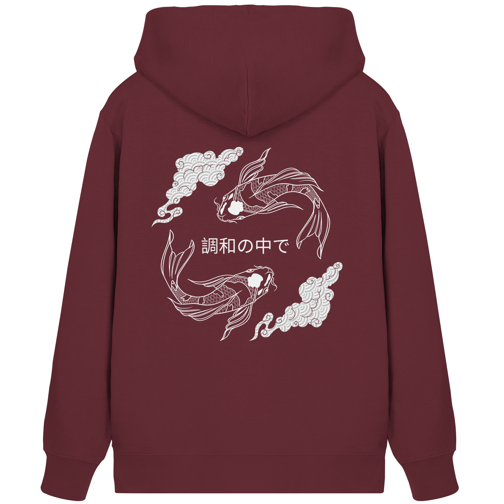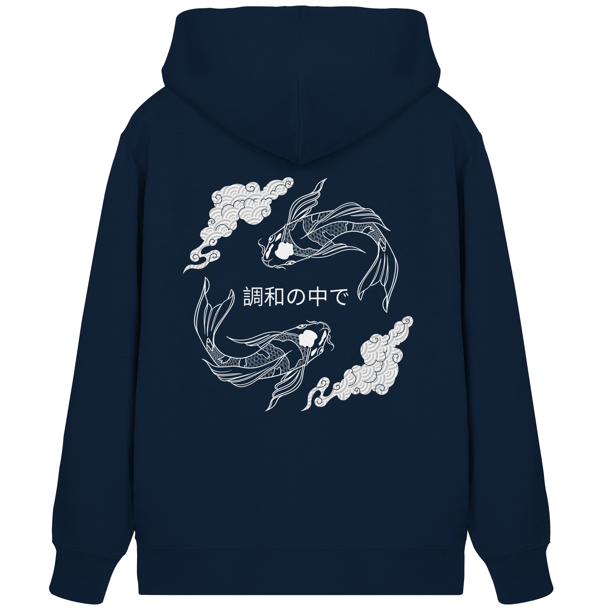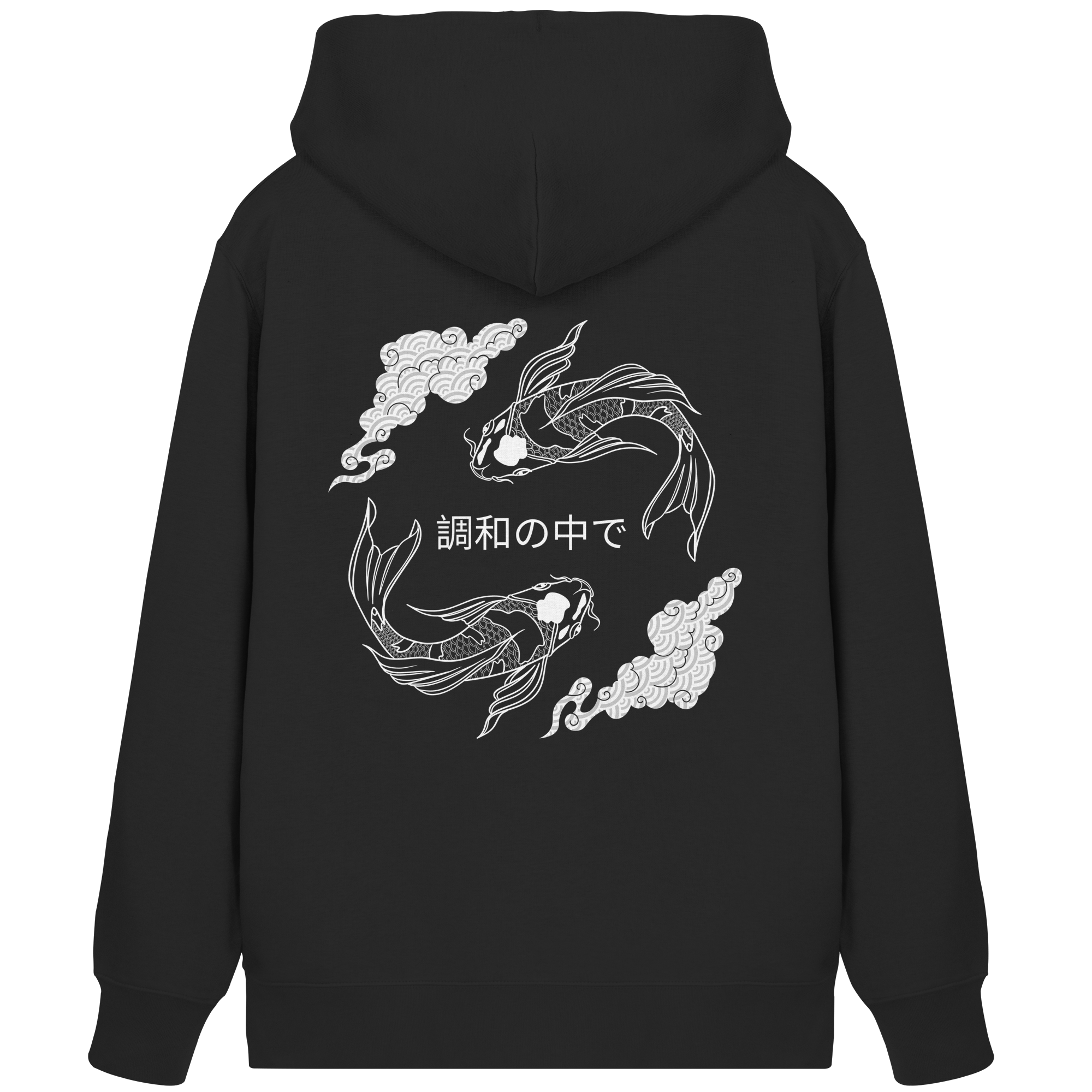 Dieses kunstvolle Design zeigt mehr als nur ästhetische Elemente. Es verkörpert eine zeitlose Philosophie des inneren Gleichgewichts und der Selbstfindung. Die anmutigen Koi-Fische, umgeben von traditionellen Wolkenmustern und ergänzt durch die japanischen Schriftzeichen