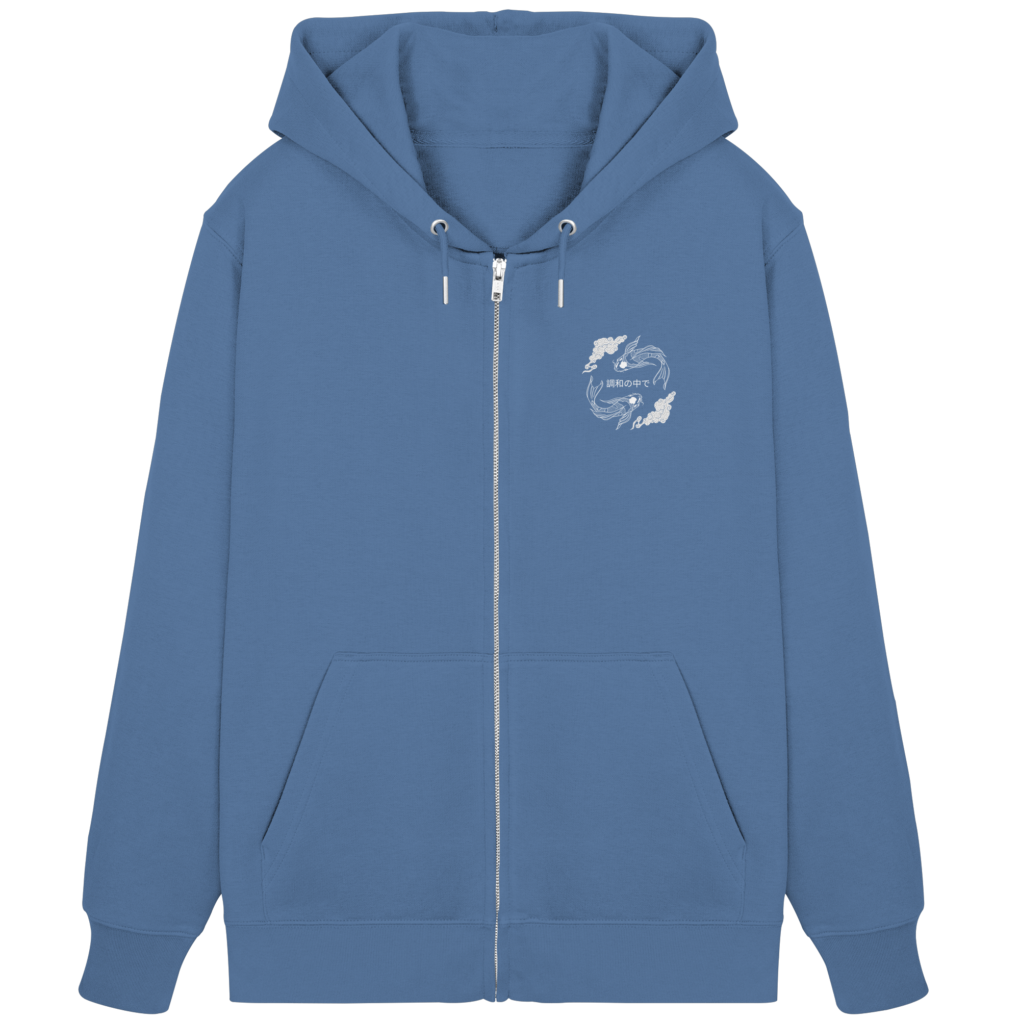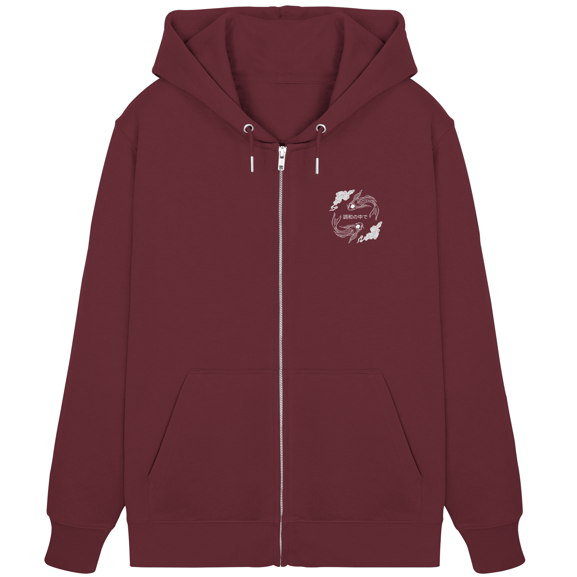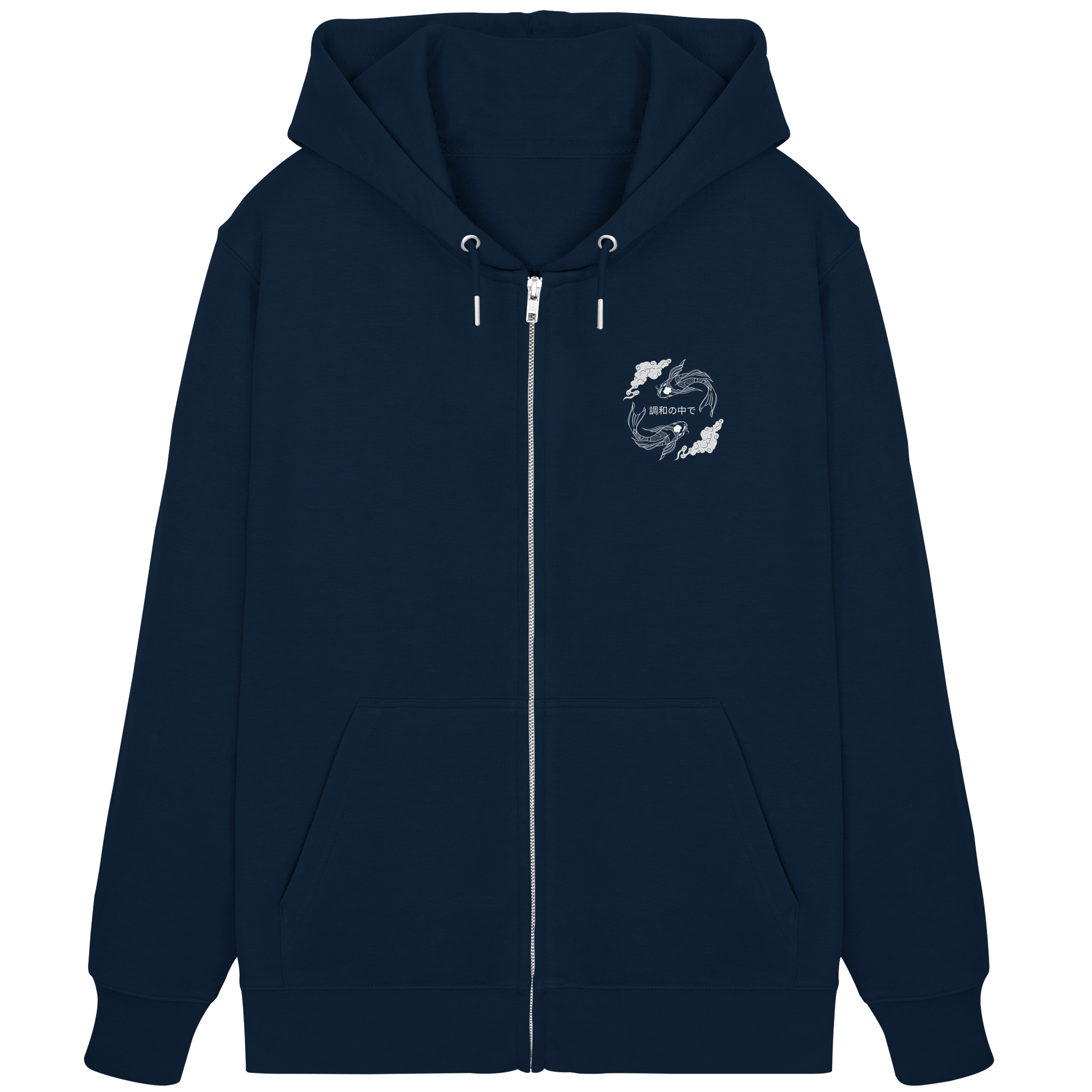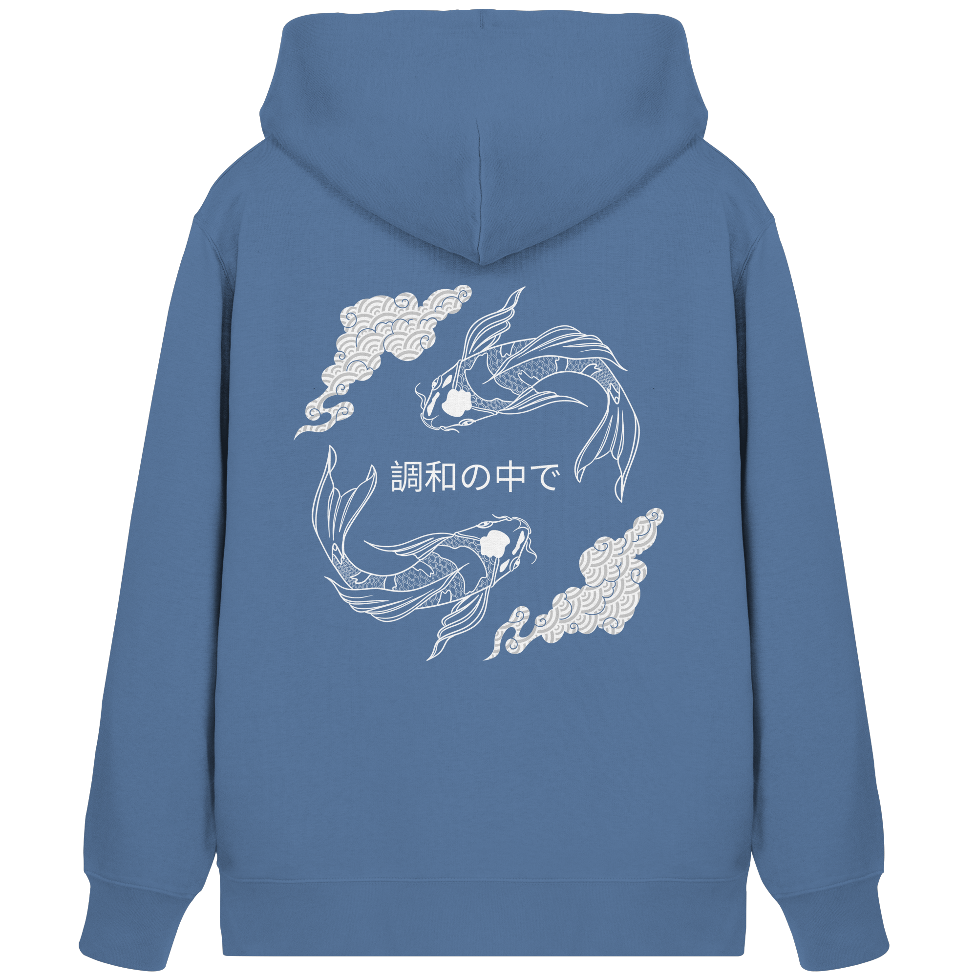 Dieses kunstvolle Design zeigt mehr als nur ästhetische Elemente. Es verkörpert eine zeitlose Philosophie des inneren Gleichgewichts und der Selbstfindung. Die anmutigen Koi-Fische, umgeben von traditionellen Wolkenmustern und ergänzt durch die japanischen Schriftzeichen