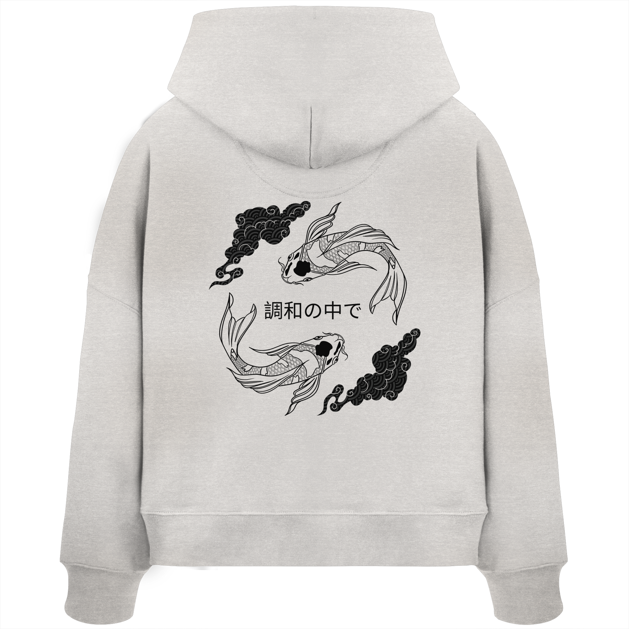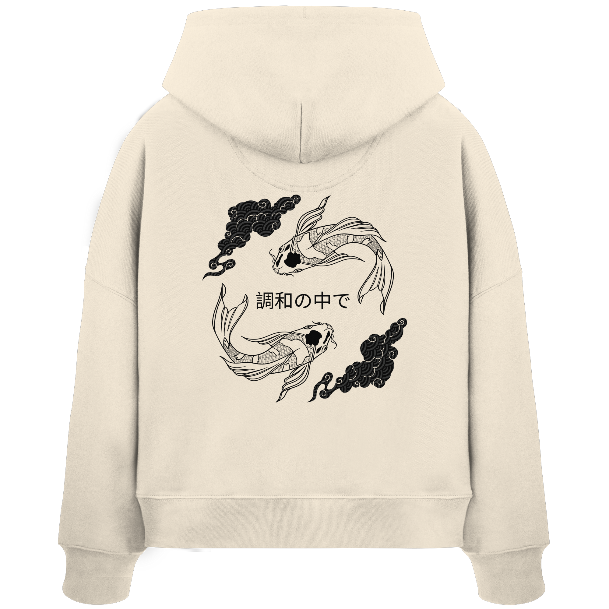 Die Koi-Fische stehen für die Reise zur persönlichen Balance und die stille Kraft, die in jedem von uns wohnt. Der schwarze Aufdruck auf den hellen Stoffen sorgt für einen klaren, scharfen Kontrast. Trage diesen HOODIE als visuellen Anker, der dich daran erinnert, selbst inmitten von Chaos Ruhe zu finden.