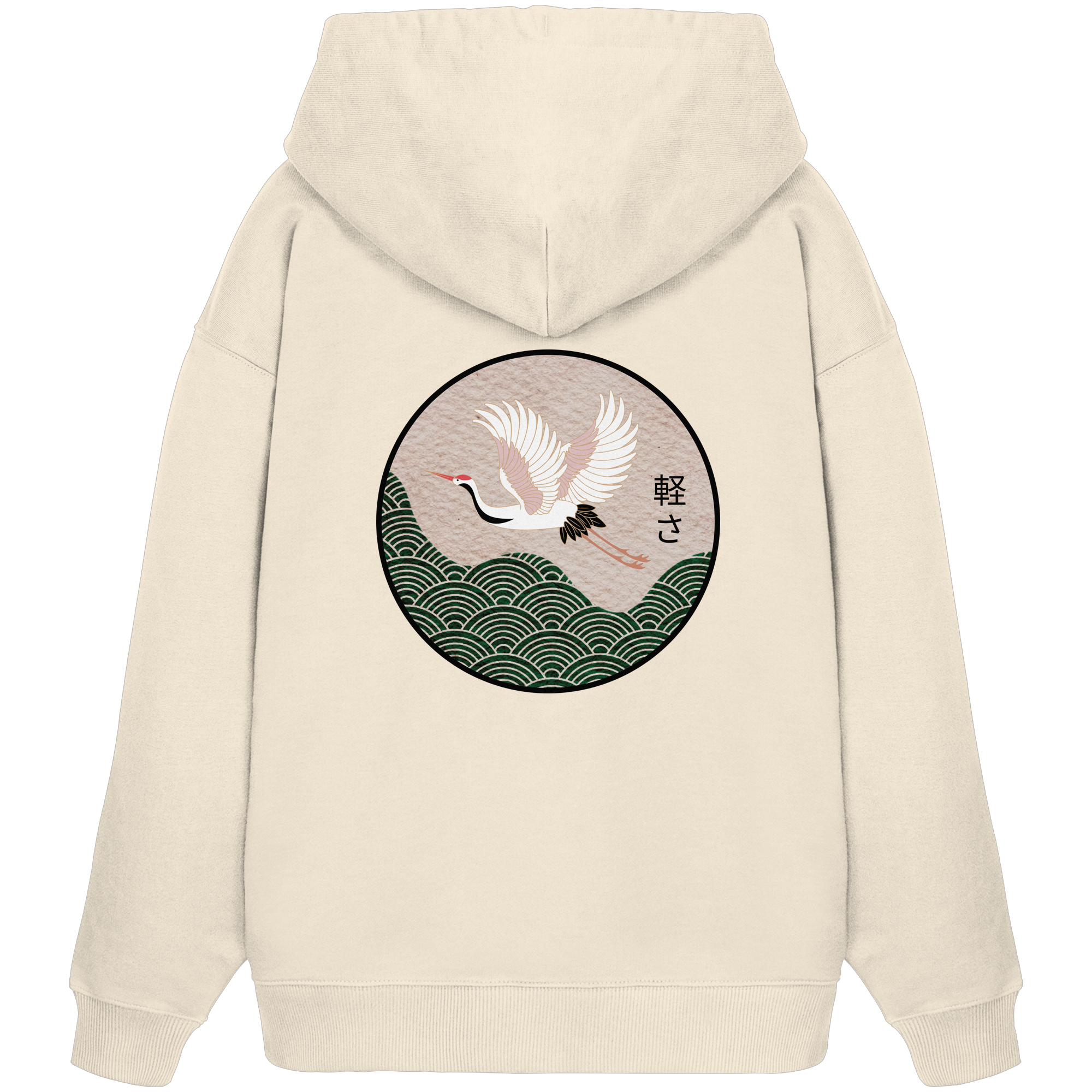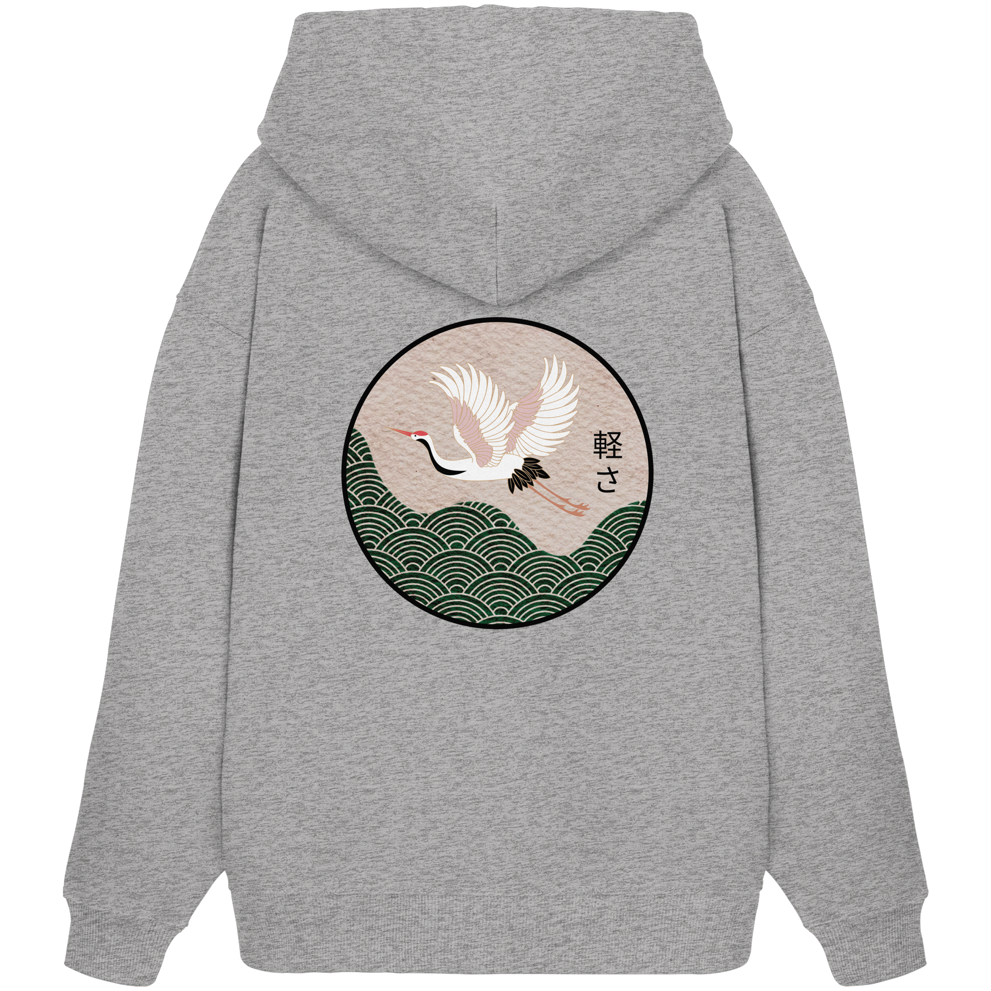 Das zentrale Designelement ist der prachtvolle Kranich, ein Symbol für Glück, Beständigkeit und Frieden. Ergänzt wird das Motiv durch das japanische Schriftzeichen: