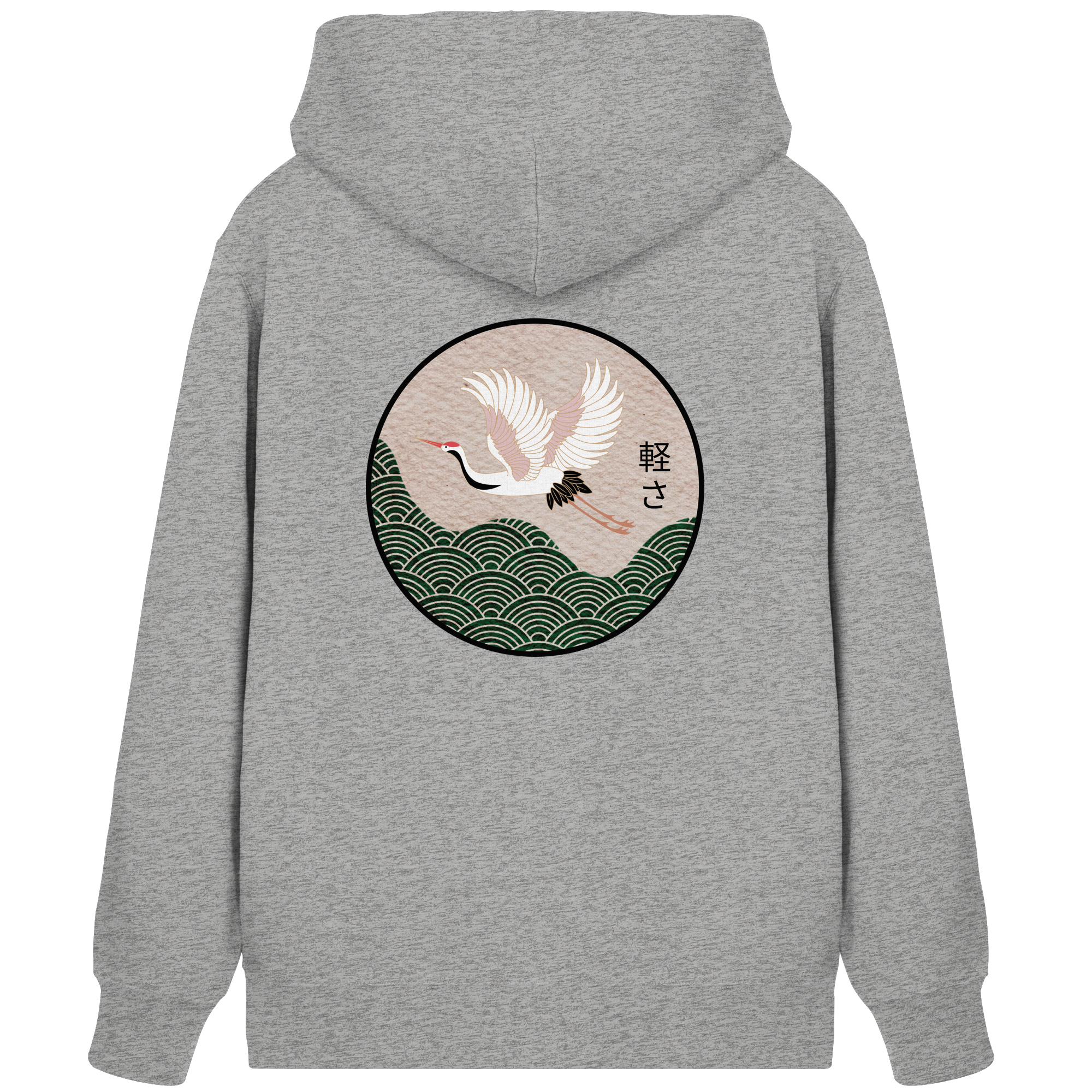 Das zentrale Motiv ist der prachtvolle Kranich, ein Symbol für Glück und Beständigkeit. Begleitet wird er vom japanischen Schriftzeichen: