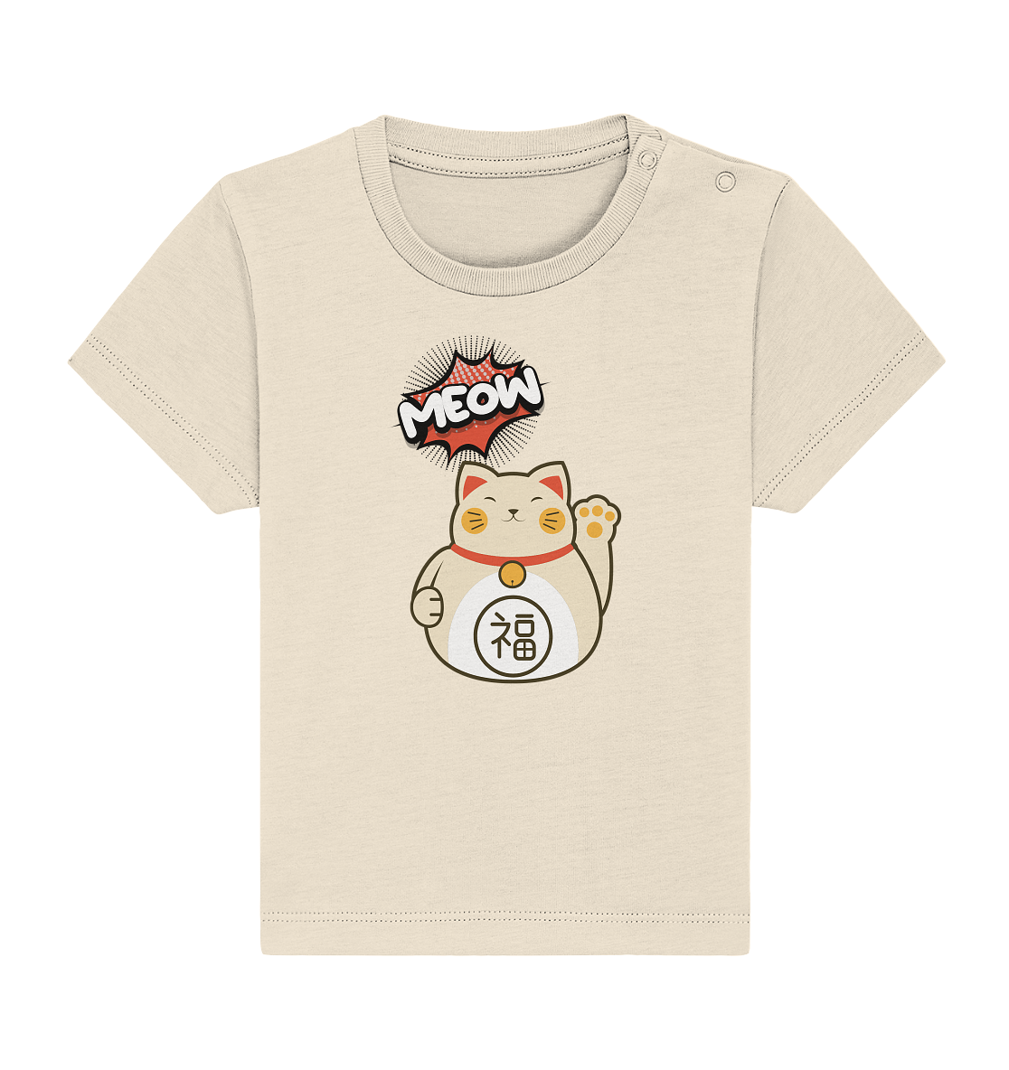 Besonders praktisch für den Alltag: Das SHIRT verfügt über eine Knopfleiste an der Schulter mit zwei Druckknöpfen, die das An- und Ausziehen kinderleicht macht – kein Kampf mehr mit kleinen Köpfchen! Der normale Schnitt sorgt dafür, dass dein Baby maximale Bewegungsfreiheit hat, während die Maneki-Neko die positive Katzenenergie in den Tag bringt.